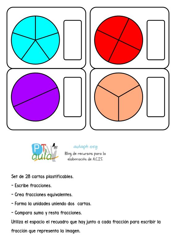 Os comparto un nuevo material que he creado para trabajar las fracciones. En él encontraréis 28 cortas más una serie de plantillasde fraccines en blanco.